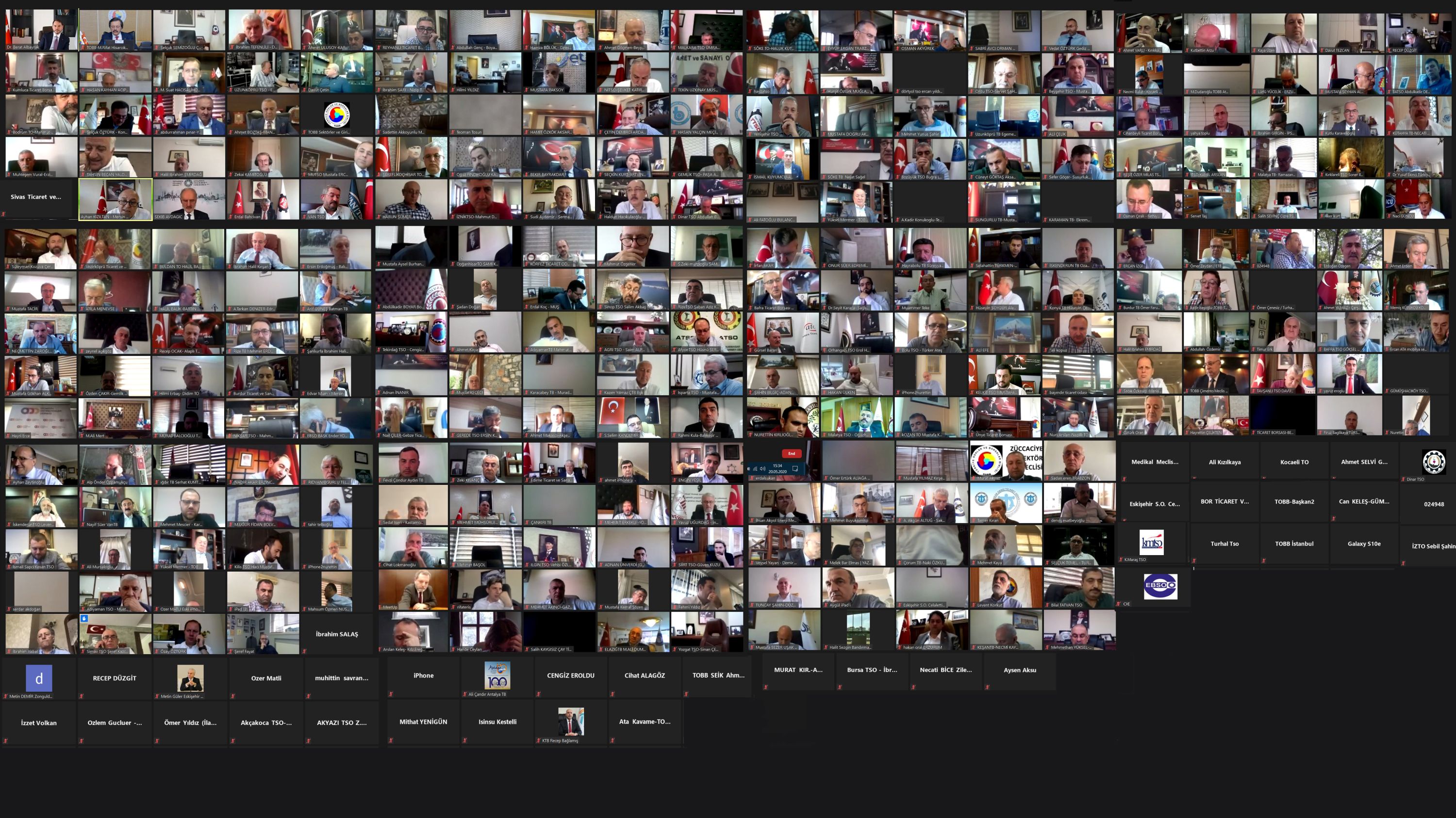 Türkiye Odalar ve Borsalar Birliği'nin (TOBB) organizasyonuyla TOBB’a bağlı 365 oda ve borsa başkanı ile 61 sektör meclis başkanının katılımıyla düzenlenen TOBB Ekonomi Buluşması, yeni tip koronavirüs (Kovid-19) salgını nedeniyle alınan tedbirler doğrultusunda video konferans yöntemiyle gerçekleştirildi. Toplantıda oda-borsa başkanları Hazine ve Maliye Bakanı Berat Albayrak ve TOBB Başkanı M. Rifat Hisarcıklıoğlu ile bir araya geldi.