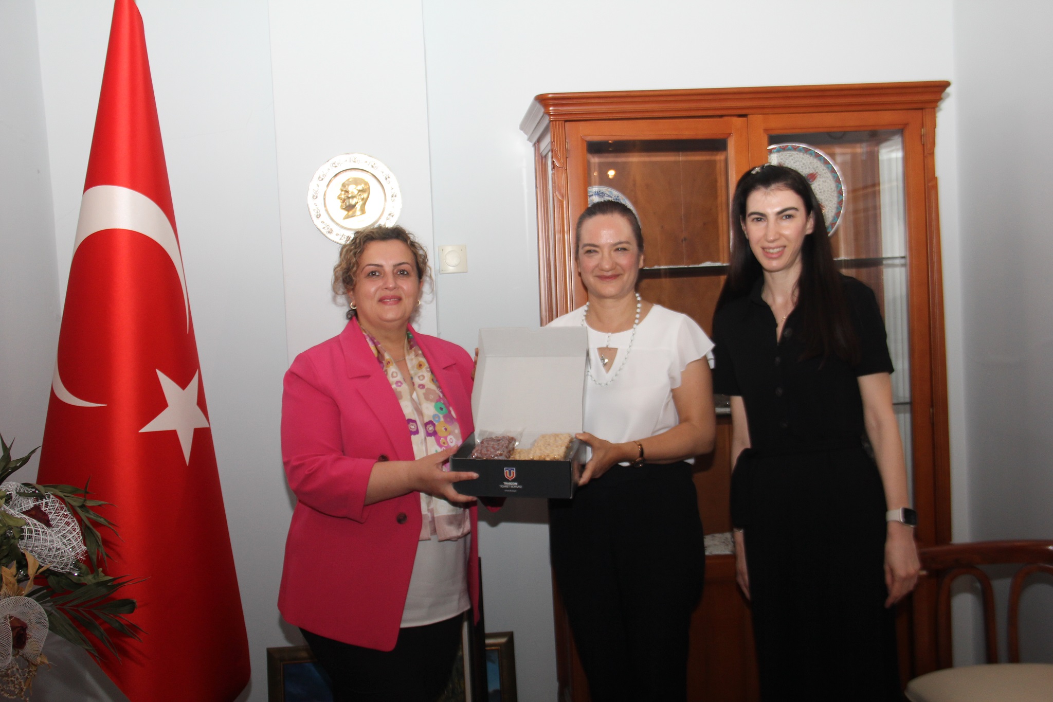 Ziyaretin anısına Başkonsolos Senem Güzel’e, başkanlarımız Özer ile Ergan Trabzonspor forması, Trabzon TSO Başkanları Eren ve Çelebi, Trabzon’un yöresel İsabella üzümünden imal edilmiş içecek ve yiyecekler, Of TSO Meclis Başkanı Zühal Akyüzlü’de Türk fındığı hediye ettiler.